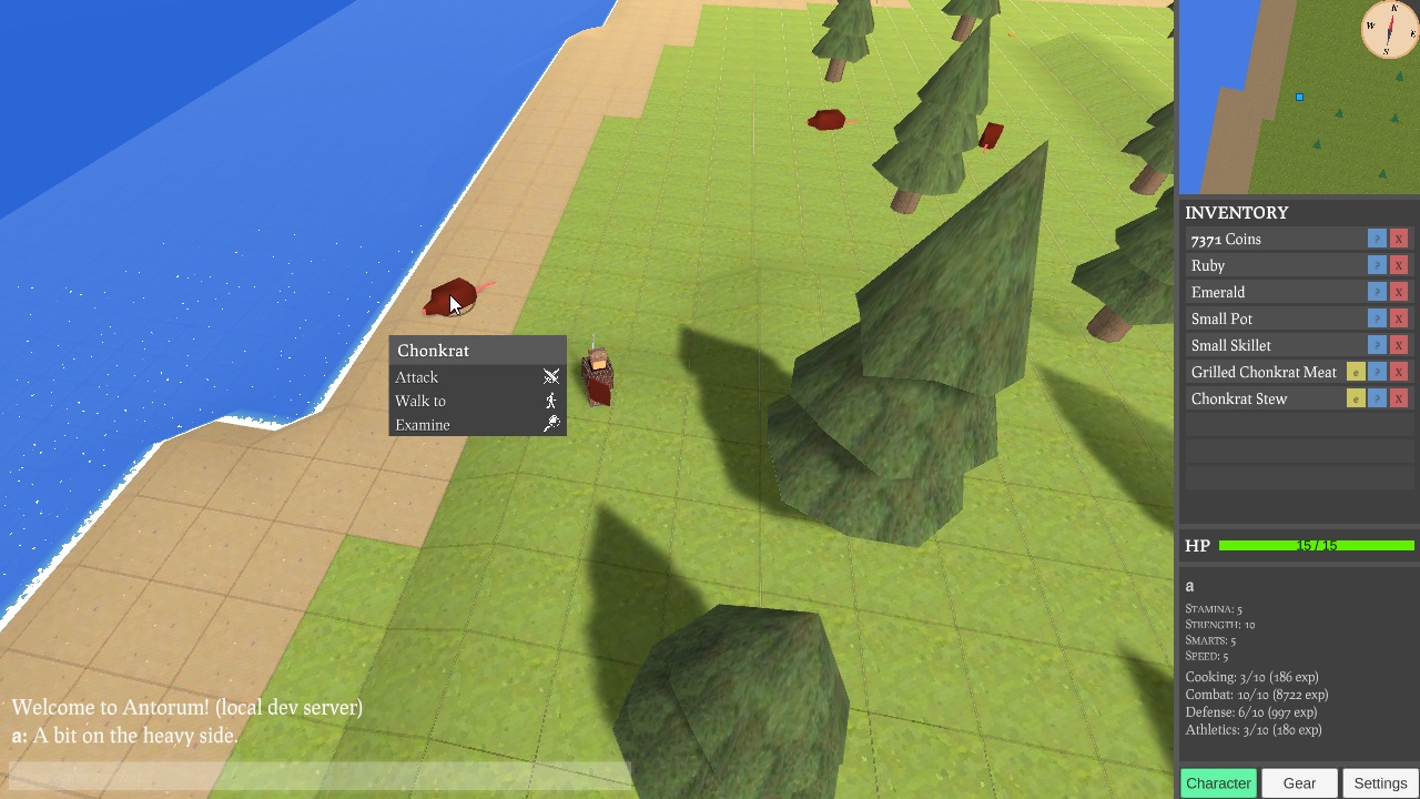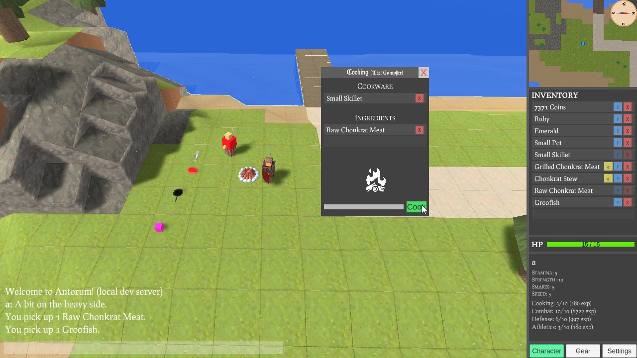 To cook, players need to be at a campfire, stove, or some other cooking "appliance". They also need some cookware like a pot or pan. Pots can be used for soups and stews, while pans can be used for fried fish, meat, and other stuff. I've only added a handful of recipes to the game so far. Recipes are written as part of an item definition. Here's the item definition for Chonkrat Stew, which can be made by cooking some Raw Chonkrat Meat inside any Pot. The player also needs to have at least level 2 in cooking - cooking a recipe that your character is not skilled enough for will most likely result in some Ruined Food.