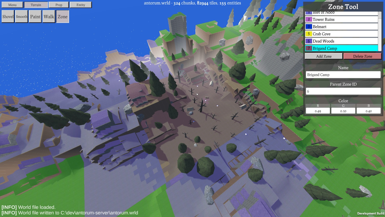 The Dead Valley is a mountain pass that I felt like decorating with dead trees and other forest detritus. It is still in early stages and doesn't look dreary enough, but I'll come back later and improve it when the time is right. I tucked a brigand camp in there to hamper players from taking the pass if they are unprepared but since I haven't implemented aggressive NPCs, it doesn't matter much right now.