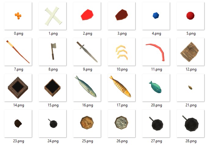 There is plenty of room for improvement. I'd like to add some outlines to the items (or maybe drop shadows, like items had in Morrowind?), and the render camera needs to adjust its size based on the bounds of the item model. You can probably see that item 21 (Cooked Blue Skipper) is looking a bit too tiny in its item icon.