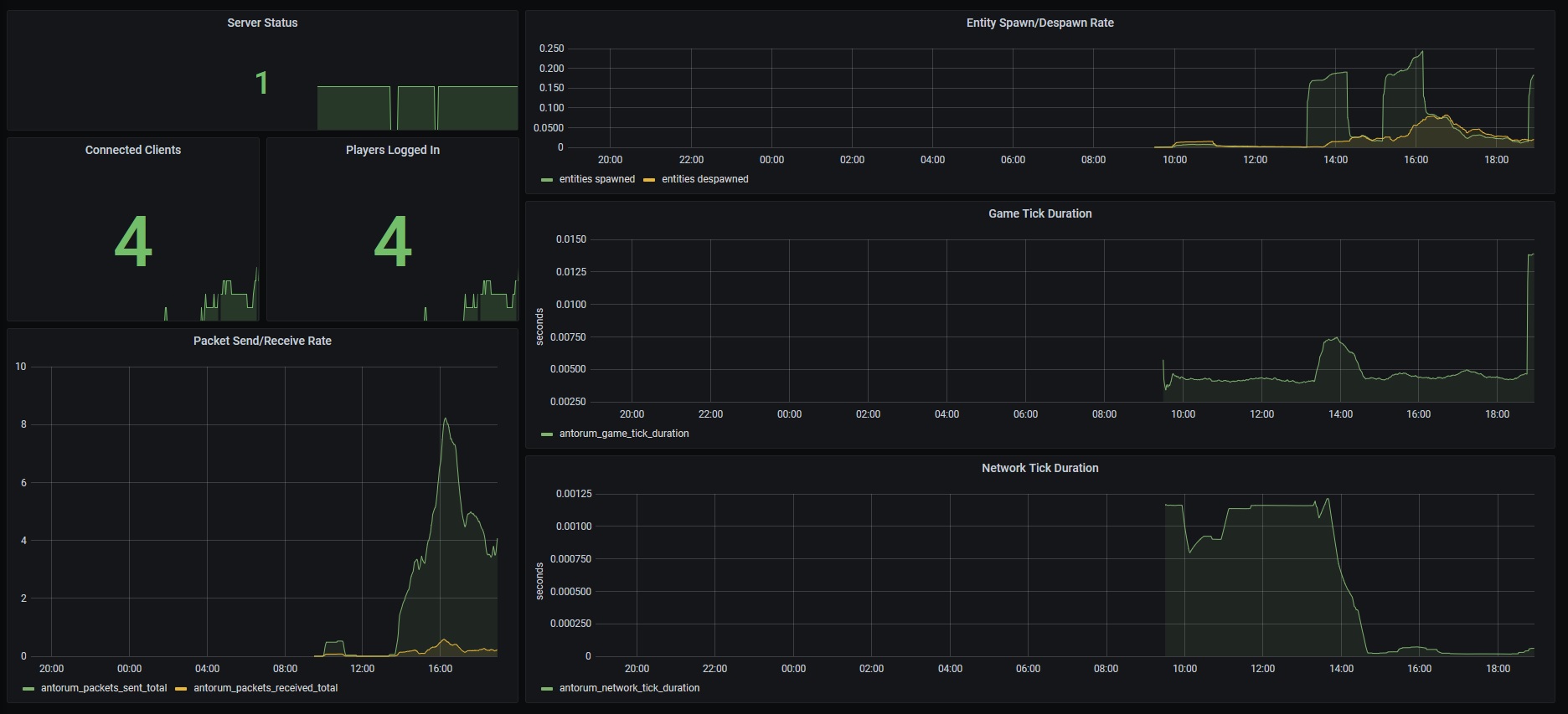 This is a Grafana dashboard, reading game server metrics collected by Prometheus. I spent a ton of time figuring out docker to get these set up locally, but after some initial frustrations it was surprisingly straight-forward to get the entire thing working. I've never worked with a time-series database before, so my dashboard is lacking, and I'm still figuring out the best metrics to display and the best ways to display them. All of my past experience is with event databases and more SQL-like query languages, so learning PromQL has been interesting.