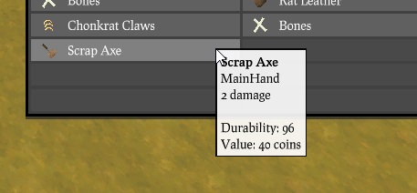 All equipment items now have a durability, and degrade as they are used in combat. The overall effectiveness of an item is affected by this durability value, so equipment that is broken will be basically useless. You can repair items with Repair Kits, available at any general goods trader. They are kind of the opposite of Salvage Kits. I also added tooltips to inventory items to make info like damage, armor, durability, etc, more visible.