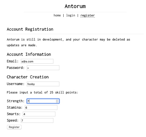 There are four stats: Strength, Stamina, Smarts, and Speed. They range from 1-10, and start at 5. At character creation, players are give 5 extra stat points, and allowed to allocate their points however they want. I'm still working on the equations for combat (like hit chance and attack damage) and how stats effect them.